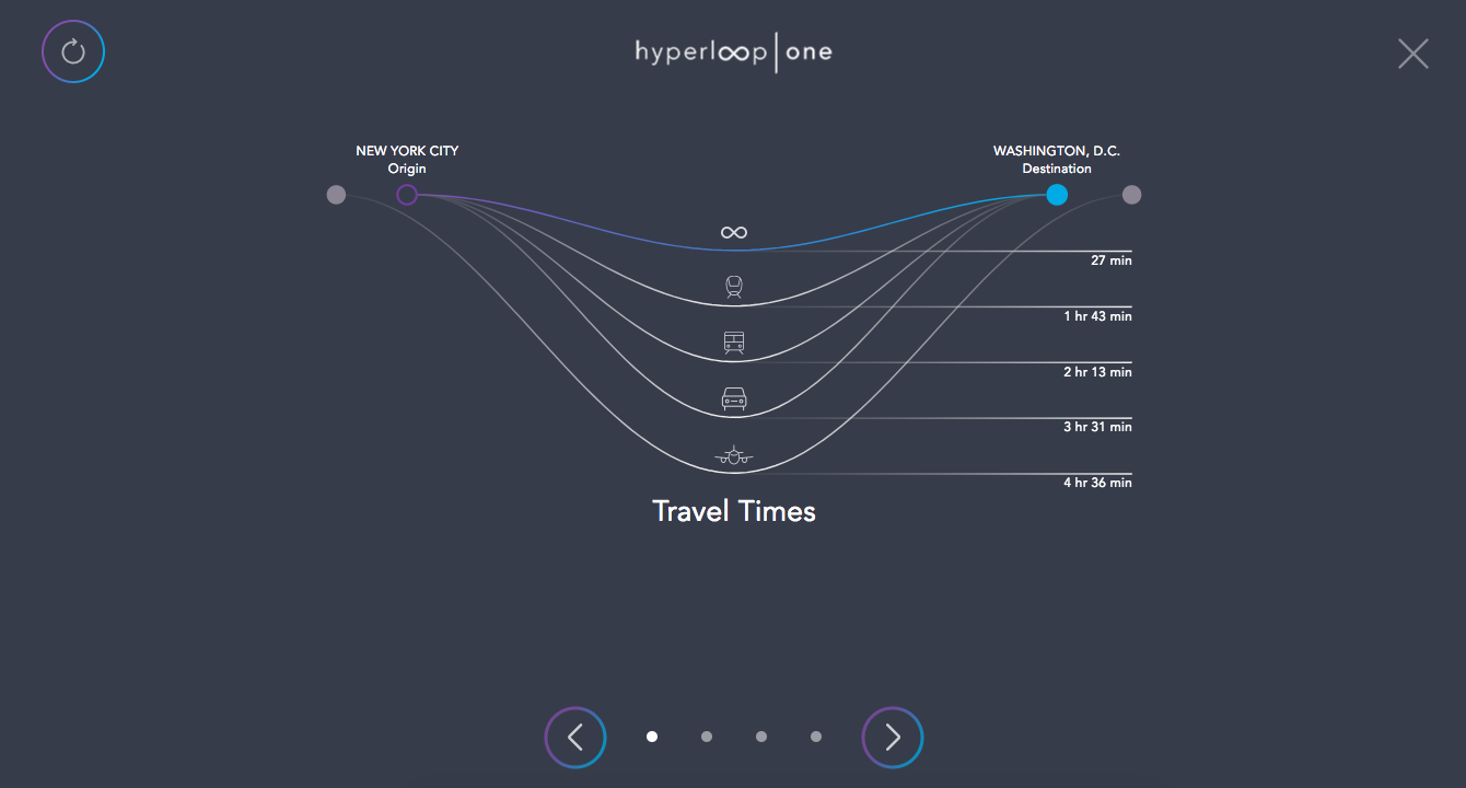 This single page app allows users to select an origin and destination city and compare transportation options between these two cities including the upcoming super high speed Hyperloop One. The users are shown animated graphics which are created on the fly to demonstrate the capabilities of the Hyperloop.